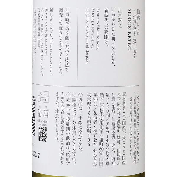 江戸返り。江戸から見た明日を信じる、新時代への幕開け。後世に残すべき江戸時代の酒造法「生もと」を尊重し、守り、進化させながら仙禽流にモダナイズ。江戸返りをテーマに【農業】【技法】【思想】に焦点を合わせた新ブランドです。レトロとは「過去に遡る事。古き良きものを懐かしみ愛好する事。」新生レトロ、まるで20年前を思わせる甘酸っぱい仙禽がそこにあります。江戸返りの中で唯一味わえる雄町米、共に歩んだ軌跡をたどります。壱式は火入れを指します。