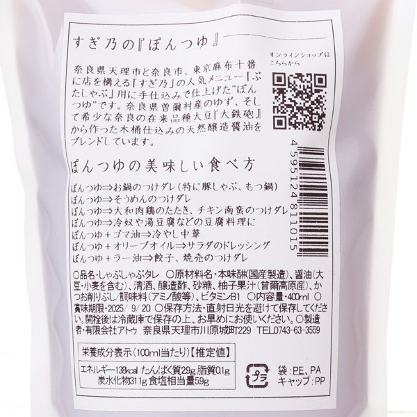すぎ乃の「ぽんつゆ」は、ぶたしゃぶ用に生まれたオリジナルの味わいです。酸っぱ過ぎず甘みのある美味しさはそのままに、原料にこだわり、「奈良の美味しい」を詰め込んだ新しいぽんつゆに生まれ変わりました。奈良県曽爾村産のゆず、そして幻と言われた奈良の在来品種大豆「大鉄砲」から作った天然醸造醤油をブレンドしています。鍋料理だけでなく、そうめん、冷やし中華、サラダなどにもアレンジしていただける万能つゆです。注意事項