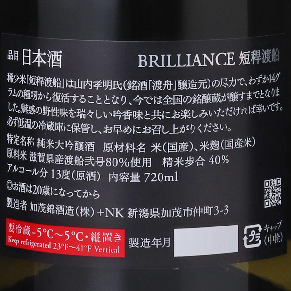 高品質で高精白米を追及するBRILLANCE シリーズ。稀少米 短稈渡船は山内孝明氏(銘酒 「渡舟」醸造元)の尽力で、わずか14gの種籾から復活する事になり、今では全国の銘醸蔵が醸すまでなりました。山田錦の父系に当たるお米で、多くの人を魅了している酒米の一つです。蔵紹介
