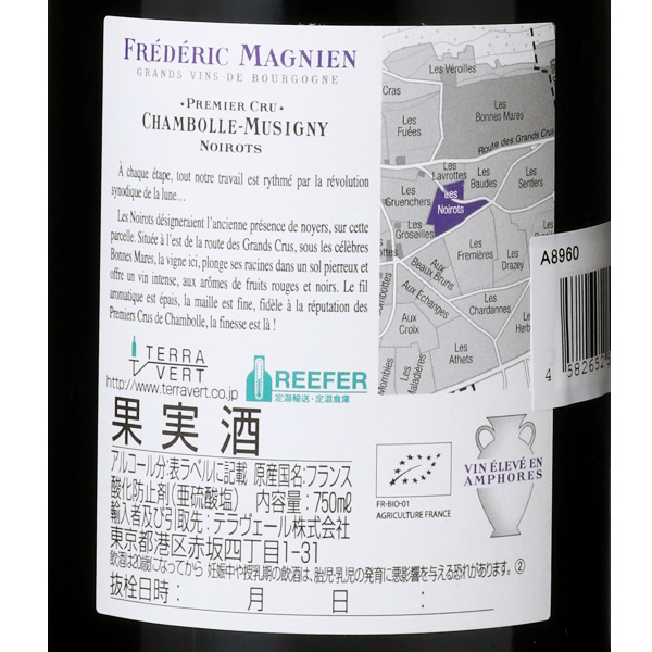 シャンボール・ミュジニー北部、グラン・クリュのボンヌ・マールの東側に位置するプルミエ・クリュ。周辺の畑より石灰岩盤層が地中深くに沈んでいて、表土の粘土質が厚くなっている関係で、筋肉質で引き締まった味わいになります。保水性が高いので暑い年でも良い結果をもたらすのが特徴です。華やかで香り高くしなやかな印象、味わいは広がりのある酸と複雑さがありながら全体として美しい輪郭を持ったエレガントな味わいです。