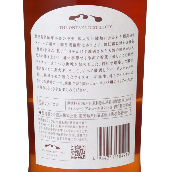 西酒造が2019年より新たな取り組みとして製造を開始したウィスキー。鹿児島県薩摩半島のほぼ中央、広大な丘陵地に拓かれた標高400メートルほどの場所に御岳蒸留所はあります。錦江湾に浮かぶ桜島(御岳)を望み、長い年月をかけて濾過され磨かれた透明感のある天然の軟水がふんだんに湧き上がり、暑い季節でも冷涼で貯蔵に適し、空気が澄んだこの地で、2019年よりウイスキー造りへの挑戦を始めました。