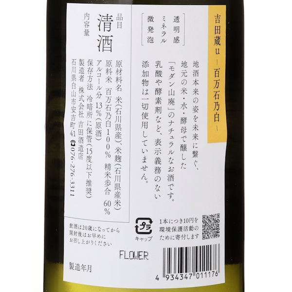 食、人、自然に寄り添うナチュラルで優しい吉田蔵u。「百万石乃白」は、2020年にデビューした石川県の酒米。乳酸や発酵助剤、酵素剤など表示義務のない添加物を一切使わず、米と水と酵母のみを使用したオリジナルレシピ「モダン山廃」で醸しました。火入ではありますがフレッシュ感を追求した瓶詰方法でかすかな発泡を感じます。特有のミネラル感とクリアな味わいが特徴です。