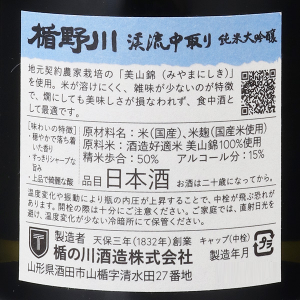 全量特別栽培で作られた酒米「美山錦」の滑らかでキレの良い酒質をいかに引き出すかに注力した1本。「楯野川 純米大吟醸 美山錦中取り」のモデルチェンジ商品です。美山錦のシャープな旨みが感じられ、上品な酸味とバランスの取れた食中酒です。飲み頃は冷酒~常温ですが、燗にしても美味しさが損なわれず、どんな料理にも合わせやすい酒質となっています。控えめながらスッキリとした爽やかな香りが特徴で、上品な酸味が広がって綺麗にまとめ上げます。蔵紹介