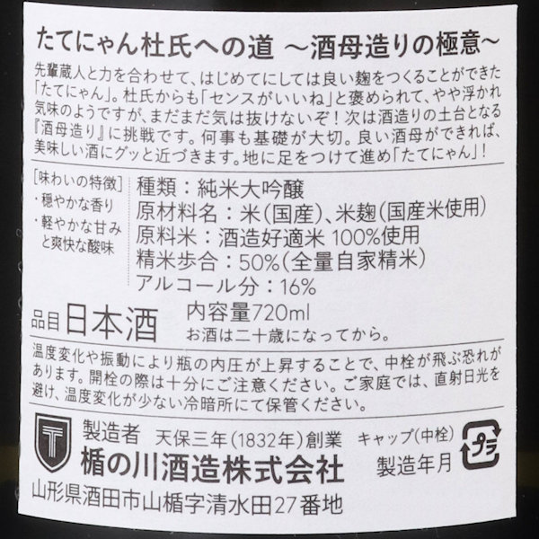 楯野川 純米大吟醸 たてにゃん杜氏への道 酒母の極意