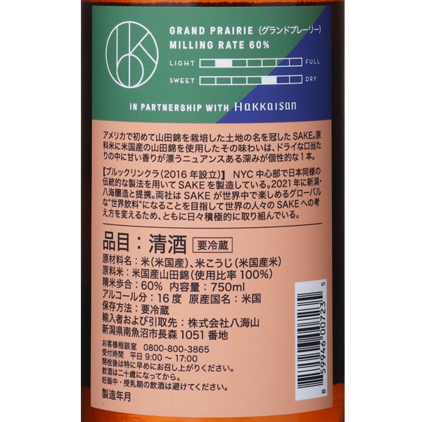 アメリカで初めて山田錦を栽培した土地の名を冠したSAKE。原料米に米国産の山田錦を使用したその味わいは、ドライな口当たりの中に甘い香りが漂うニュアンスある深みが個性的な1本です。【ブルックリンクラ】