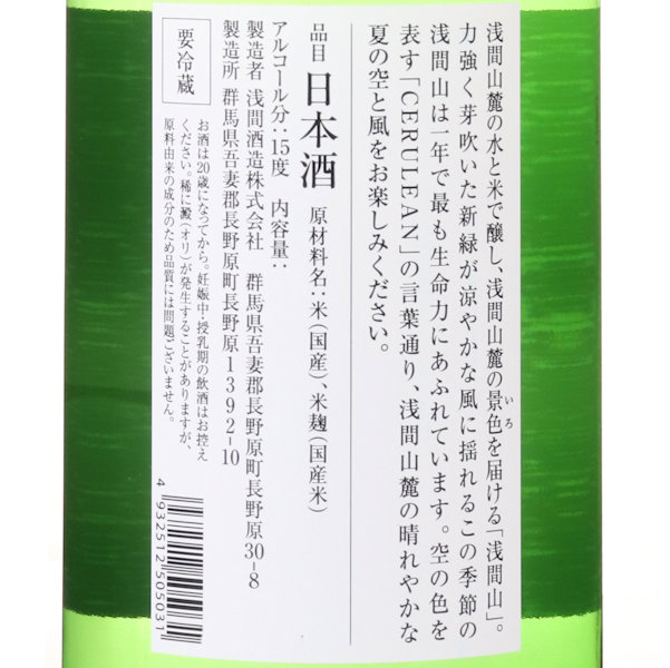 浅間山麓の水と米で醸し、浅間山麓の景色を届ける「浅間山」。夏酒となるこちらの新商品は、空の色を表す「CERULEAN」の言葉の通り、浅間山麓の初夏に広がる空色をお届けする一品です。夏の食材と一緒に楽しみながら浅間山麓の晴れやかな夏の空と風を感じていただければ幸いです。蔵紹介