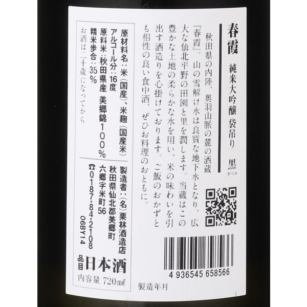 蔵のある秋田県は美郷町で栽培された美郷錦を使用した純米大吟醸を袋吊りしたお酒です。鼻孔をくすぐる奥ゆかしく品のある香りと清らかでシルキーな口当たり、均整の取れた五味のバランス。春霞の代名詞とも言える食中で映える香りと味わいのバランスがより純度高く感じていただけます。蔵紹介