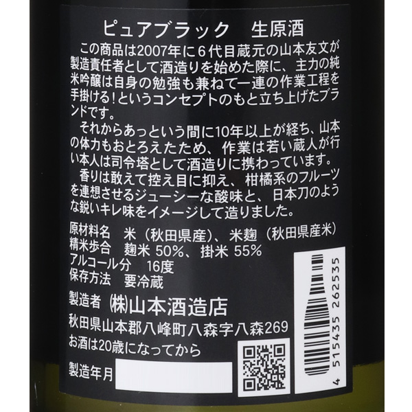 山本の代名詞とも言える「ピュアブラック」の貴重な生原酒です。果実系のジューシーな酸味、そしてその後に来る日本刀のような切れ味に生原酒ならではの弾けるようなフレッシュさが加わりました。普段とはまた一味違うインパクトをお楽しみください。蔵紹介