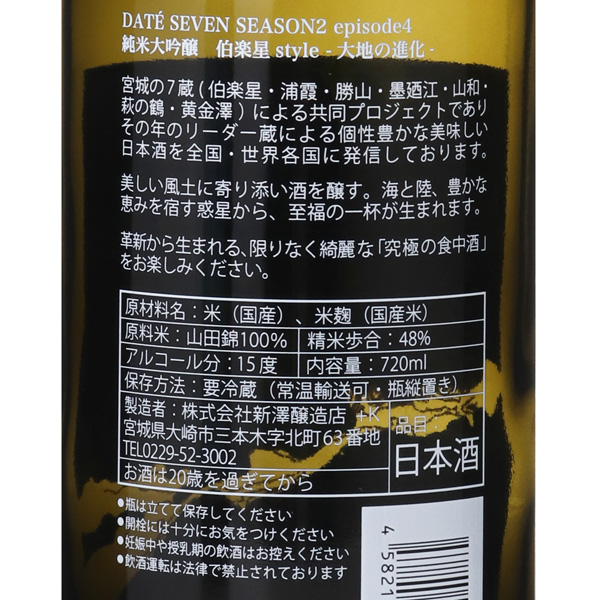 「DATE SEVEN」は、宮城の7蔵(浦霞・伯楽星・勝山・墨廼江・萩の鶴・黄金澤・山和)による、共同醸造プロジェクト。技術交流を図り切磋琢磨しながら、酒質を更に磨き上げます。「SEASON2」ではふたつのリーダー蔵が同じ原料米と精米歩合の同スペックで仕込み、蔵元の個性を活かした美味しさを表現しました。同スペックで仕込むことにより、リーダー蔵はおのずと競い合い、品質向上に励みながら自社の酒造りを追求します。伯楽星styleは、革新的な「伯楽星の酒造り」と蔵のある宮城県川崎町から”山”をイメージし、等高線の要素を取り入れて山高さを表現したデザインとなっています。完熟したメロンを思わせる艶のある香り。口に含めば白葡萄に似た気品ある味わいが広がります。フレッシュな酸味が優しい甘さと折り重なりながら儚くも綺麗に消えてゆきます。