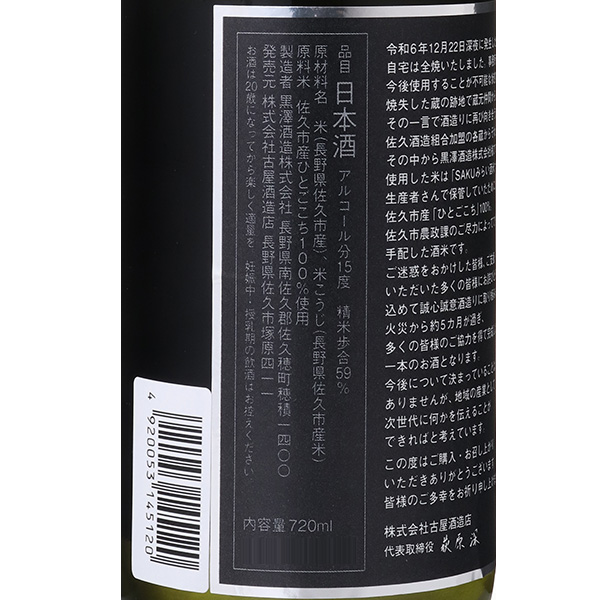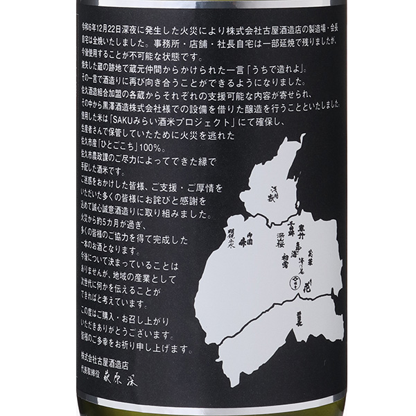 2024年末の火災により蔵が全焼した古屋酒造店。その後、同じ佐久市内の蔵元や佐久市農政課、酒米農家など、多くの方々の協力と支援を受け、火災を免れた酒米を使って黒澤酒造にて委託醸造されたお酒が、このたびリリースされました。製造されたのはタンク1本分のみとごくわずかですが、蔵の再建に向けた新たな一歩として、多くの方にこの想いのこもったお酒を味わっていただければ幸いです。