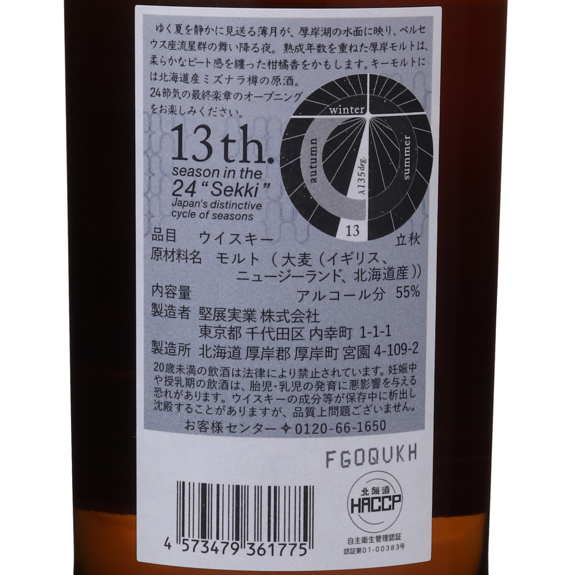 ゆく夏を静かに見送る薄月が、厚岸湖の水面に映り、ぺルセウス座流星群の舞い降る夜。熟成年数を重ねた厚岸モルトは、柔らかなピート感を纏った柑橘香をかもします。キーモルトには北海道産ミズナラ樽の原酒。24節気の最終楽章のオープニングをお楽しみください。香り:桃や杏のコンポート、カスタードプリンに添えたバニラ、黒蜜、干し柿、焚き火のようなやわらかな煙香