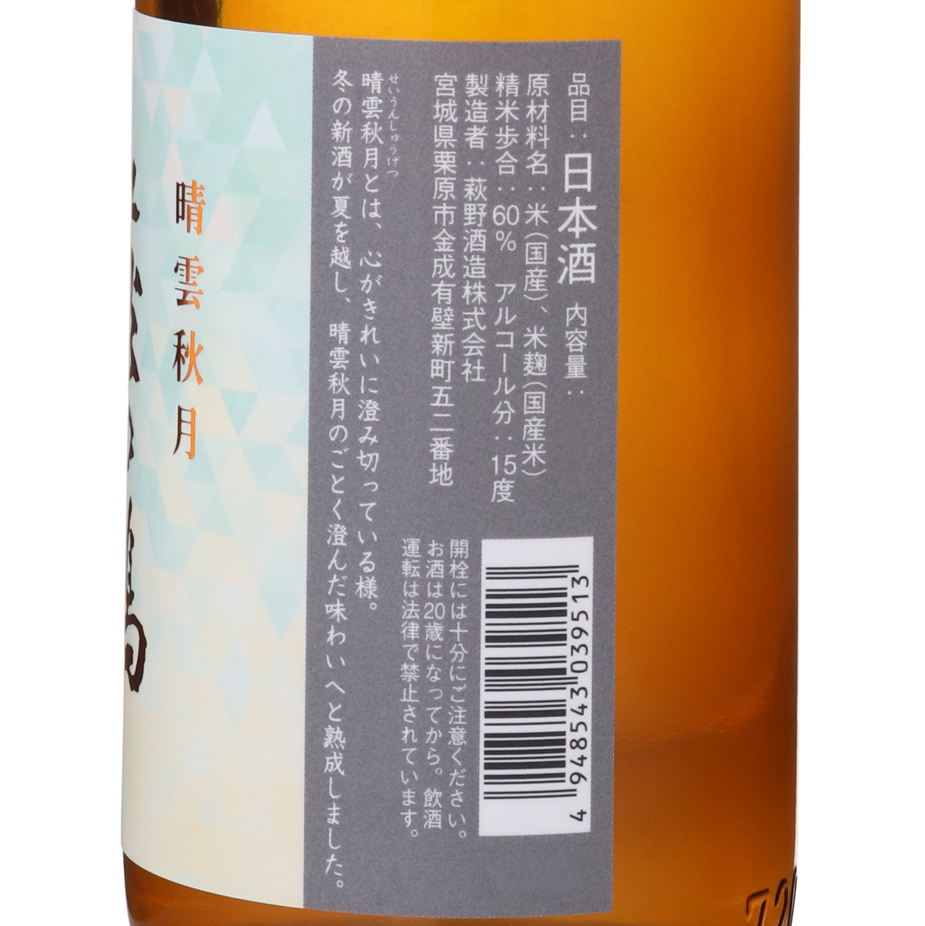 萩の鶴の「秋あがり」が、名前も新たにリニューアルしました。「晴雲秋月(せいうんしゅうげつ)」とは、心が澄み切った様子を表す言葉で、冬に搾られた新酒が夏を越し、まるで晴雲秋月のごとく澄んだ味わいへと熟成したことを意味しています。穏やかな香りとやさしい酸味に、ひと夏の熟成によるまろやかさが加わり、すっきりとしながらもやわらかな飲み口に仕上がっています。蔵紹介