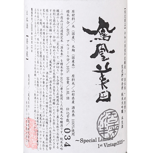 醪を搾る際、最初に圧力を掛けずに出てくるにごりを含む「荒走り」、続けて出てくるにごりのない透明な「中取り」、最後に圧力を掛けて絞ったお酒を「押し切り」と呼び、本商品では荒走りと押し切りの部分を合わせ、一本のお酒にした個性的な鳳凰美田です。今回は精米歩合40%以上の純米大吟醸の荒押切を集めた特別ヴァージョンとなっています。蔵紹介