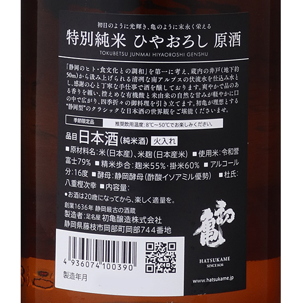 高品質の玉露の産地だけでなく、高品質の日本酒もあります!寛永12年、1636年創業。現在の静岡市で創業し、明治初期の頃に現住所である岡部町に移りました。岡部町は東海道五十三次の宿場として栄えたことで有名で、初亀は旅人の癒しとして愛されていました。現在では高品質の玉露がとれることでお茶が有名です。そんな蔵元の酒造りは、兵庫県東条産の山田錦を始め、富山県南砺産の五百万石、雄山錦とこだわった原料を蔵内に流れる南アルプスの伏流水で醸します。量より質にこだわり、お客様の為に日々酒造りに勤しんでいます。