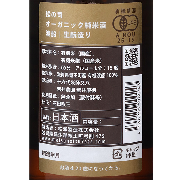 地下120Mの大きな岩盤の下を流れる鈴鹿山系愛知川伏流水を仕込み水とし、100%契約栽培により栽培法を定め十分に審査された酒米を、蔵人が時間をかけて精米。酒に味わいをつける箱麹法による麹造りや、酒質を決める社内保存酵母菌による速醸酒母と、昔ながらの生もと酒母の採用。また、発酵温度を低温に抑えながらも完全発酵を目指す小仕込み(1.2t以下)によるモロミ工程、そして瓶詰貯蔵による低温熟成管理(5℃以下)など、永年の経験による出来る限り丁寧な手造りで、深遠な味わいの「松の司」を醸しだします。(松瀬酒造HPより)