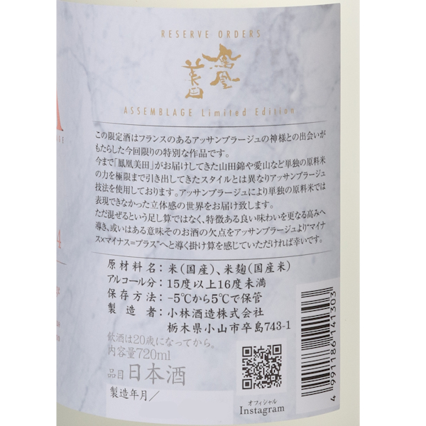 鳳凰美田より、初めてAssemblage(アッサンブラージュ)技法を取り入れた、新たな日本酒の世界をお届けいたします。これまでの、単一の酒米のチカラを極限まで引き出すスタイルとは一線を画し、複数のお酒それぞれの個性を理解し、掛け合わせることで互いの魅力を引き立て合い、立体的でまったく新しい味わいを生み出しています。 単に「混ぜる」のではなく、「分解し、再構築する」ことで誕生した、鳳凰美田の新たな世界。 日本酒の可能性を広げるこの一本、ぜひご堪能ください。