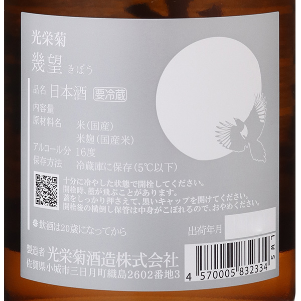 ほとんど満月という意の幾望(きぼう)。天然乳酸菌仕込みならではの味わいを引き出すため春に上槽・瓶詰したものを約7カ月ほど氷温で貯蔵しています。上立ち香は穏やかですが、口に含むと巨峰を思わせるフルーティーな香りと、ふくよかな甘みが広がります。 巨峰の皮のような酸味と渋みが全体を引き締め、余韻には旨味がじんわりと広がります。 開栓直後から日を追うごとに味わいが深まり、時間をかけてゆっくりとお楽しみいただける一本です。蔵紹介