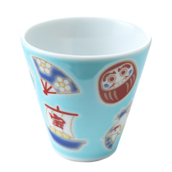 おめでたい縁起柄をあしらったお猪口です。幸多かれとの願いが込められており、九谷の絵具で鮮やかに表現しています。