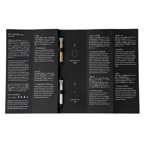 現代アートとのコラボレーション日本酒として2015年に発売。以来、毎年様々なアーティストとコラボレーションしています。高度精米になると麹の製造が極端に難しくなり、麹由来の旨味を引き出しにくくなるのですが、NIIZAWAについては、同じ7%精米である『残響Super7』の2倍程度の米の旨味を引き出すことに成功した、技術溢れる1本となっています。米の甘みをダイレクトに感じることができ、常に余韻が長く、じっくりとお楽しみいただけます。冷蔵庫で保管することにより、綺麗に熟成していきます。『”世界一の精米”をお届けする』という指針からスタートした7%精米シリーズの最高峰に位置するお酒で、年間1000本限定の貴重な1本です。