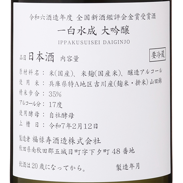 一白水成 全国新酒鑑評会10回連続金賞受賞酒 *クール便のみ