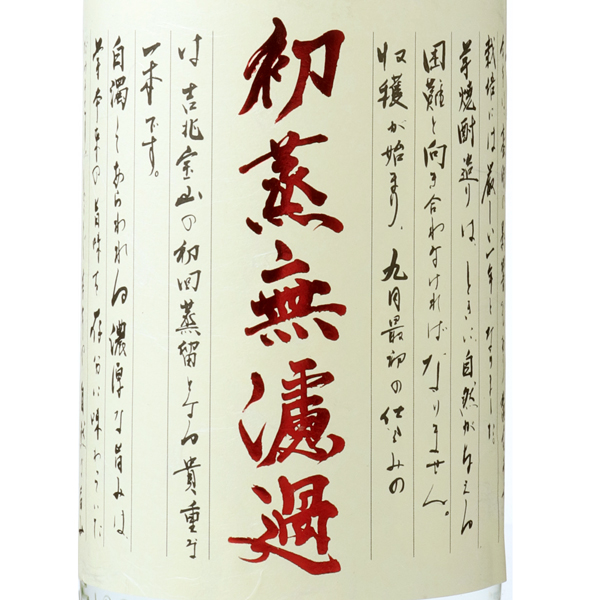 蔵内でしか味わえない吉兆宝山を無濾過直詰め。芋本来の旨みを最大限に楽しめるように無濾過で仕上げ、一番旨味のある最高の「中取り」部分だけをボトリングし、濃厚な旨みは濁りとして表現しています。吉兆の旨さを更に伝えて行く事をテーマに造られた商品であり、焼酎好きに是非飲んでほしい味わいに仕上がっています。※新焼酎で濁り成分があるため、飲む前には上下よく混ぜてからお召し上がりください。
