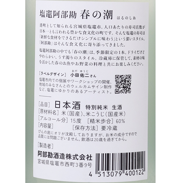 上槽後、速やかに瓶詰めを行い、爽やかなガスがらみでフレッシュ感のある、スッキリとしたタイプのうすにごりです。チリチリと微発泡感があり、キレのある酒質ですので杯を重ねられるタイプのお酒として、素材の味を活かした春の魚や野菜のお料理とともにお楽しみいただけます。今回新たに制作したラベルデザインは、塩竈市内で個展やワークショップを開催するなど、塩竈にゆかりのあるアーティスト「小田佑二」さんによる作品です。春らしく爽やかな色合いで塩釜港をイメージし描かれた水彩画です。注意事項