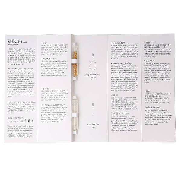 現代アートとのコラボレーション日本酒として2015年に発売。以来、毎年様々なアーティストとコラボレーションしています。高度精米になると麹の製造が極端に難しくなり、麹由来の旨味を引き出しにくくなるのですが、KIZASHIについては、同じ7%精米である『残響Super7』の1.5倍程度の米の旨味を引き出すことに成功した、技術溢れる1本となっています。『NIIZAWA純米大吟醸』と『残響Super7』の間の糖度で仕上げており、綺麗な甘さの中に若さも感じる味わいです。お料理と合わせた食中酒として、また熟成も楽しめるお酒となっています。年間1000本限定の貴重な1本です。
