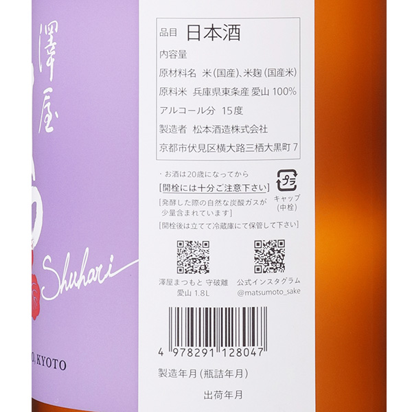 原料に勝る技術は無し!1791年創業。京都市伏見の歴史ある酒蔵で、赤レンガ蔵と八角形の煙突が印象的な酒造蔵は、近代化産業遺産に指定されています。澤屋まつもとのコンセプトは、守破離 (しゅはり) 。澤屋まつもとの伝統を守ること。伝統を破り、他で学んだことを実践すること。守と破を大切に、そこから離れて新たな価値観を見出すこと。京都の酒蔵として、京都の水、良質な米の旨みを表現。透明感、旨み、爽やかさ、シンプルな中に、エネルギーを感じられるお酒です。