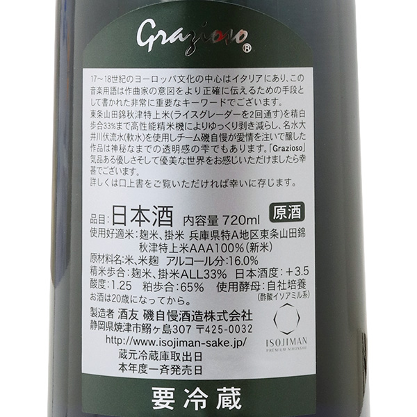 中取り35%がリニューアル。特A地区東条秋津産特上米"山田錦"を最新鋭の精米機で精米歩合33%まで丁寧に磨き、寝る間を惜しんで丁寧に造る麹。それを大井川伏流水で低温でじっくりと発酵させ、最高のポイントを見逃さず槽で搾ぼることで出来上がります。イタリア語で「優美に気品ある」を意味するGRAZIOSOを冠する、優雅な味わいをご堪能ください。注意事項