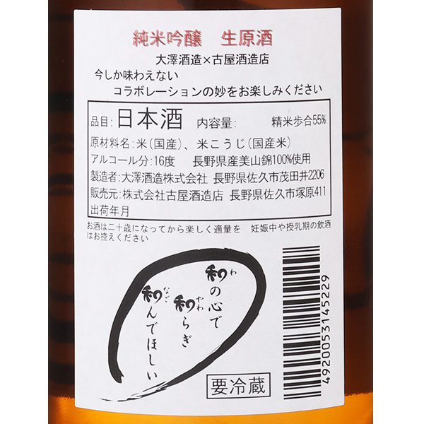 2024年末の火災から再建に向けて歩み始めた古屋酒造店。今年は、大澤酒造様のご厚意によりタンクをお借りし、仕込みを行わせていただけることに。その第一弾となるお酒がいよいよ到着です。大澤酒造の「明鏡止水」とも、古屋酒造店の「和和和」とも異なる、新たな挑戦から生まれた一本。両蔵の名を掛け合わせ「おおさわわわ」と名付けられました。再建への道のりはまだ始まったばかりですが、このお酒を通じて皆さまに応援していただけましたら幸いです。蔵紹介