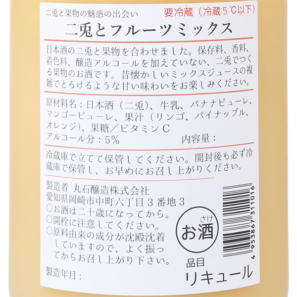 人気銘柄「二兎」をベースに、冬の果実酒として“昔懐かしいミックスジュース”の味わいをお酒で再現した一本です。バナナ、マンゴー、リンゴ、パイナップル、オレンジの5種の果実に、牛乳を加えることでまろやかでコクのある口当たりに。香料・着色料・醸造アルコールは一切不使用。果実と牛乳の自然な甘みがやさしく広がり、純米酒のふくよかな旨味と調和した贅沢な味わいに仕上がっています。そのままはもちろん、ソーダ割りやデザート感覚で楽しむのもおすすめ。心ほどける、冬のご褒美リキュールです。蔵紹介