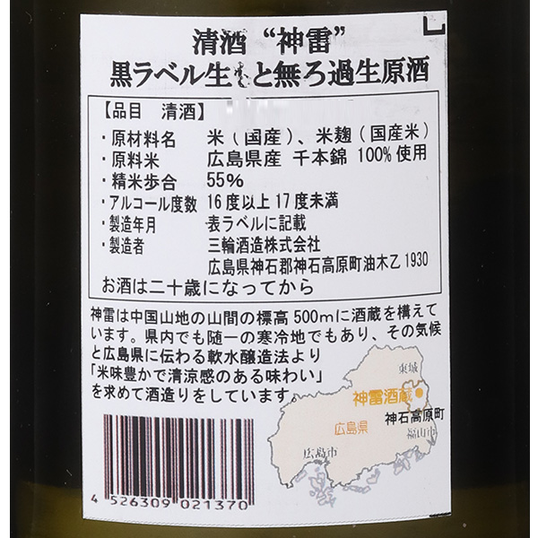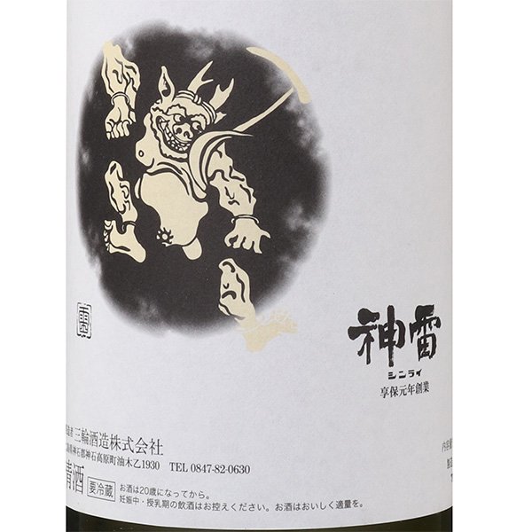 課せられた使命は、先人たちが築き上げた清酒という文化を伝承し、生活の潤いを、人生の喜びと悲しみを、共に味わっていくこと1716年創業。酒銘の神雷の由来はその昔雷が酒造蔵に落ちたが、大過なかったこと、また神石にあやかった事から。ちなみに稲妻は稲の妻と書くとおり、豊かな恵みをもたらす象徴であることから、大変縁起の良い名前です。酒蔵は中国山脈の山あい、標高500mに位置し、冬場は氷点下を記録します。さらに夏場も涼しいため、お酒の仕込、貯蔵共に大変適した環境が整っています。また、裏山の井戸から軟水、蔵の地下からは中硬水が得られ、用途によって使い分けが出来るのも特徴となっています。