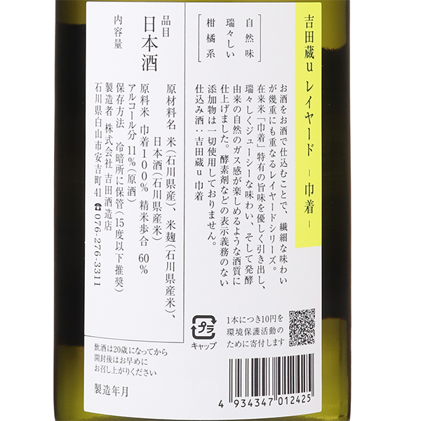 吉田蔵u新シリーズ「レイヤード」第二弾!仕込み水の代わりにお酒でお酒を仕込むことで繊細な味わいが幾重にも重なることから「レイヤード」と名付けられました。第二弾は、石川県の在来米「巾着」を使用しています。力強い旨味が特徴の酒米ですが、旨味を少し抑えて、瑞々しくジューシーな味わい、そして発酵由来のガス感が楽しめるような酒質に仕上げられています。よく冷やして、ワイングラスや冷酒グラスでお召し上がりください。乳酸や発酵助剤、酵素剤など表示義務のない添加物を一切使用していないナチュラルなお酒です。