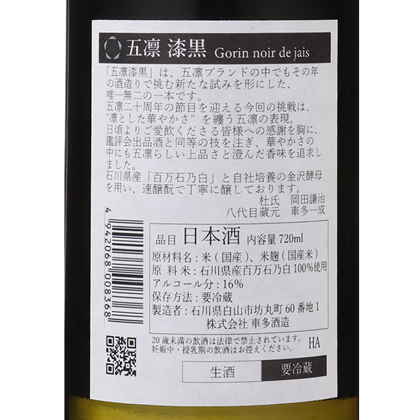 「五凛 漆黒」は五凛ブランドの中でも、その年の酒造りで挑む新たな試みを形にした、唯一無二の一本です。「五凛」二十周年の節目を迎える今回の挑戦は、“凛とした華やかさ”を纏う「百万石乃白」を用いた「五凛」の新たな表現です。食中でより輝やかせるために、上品で落ち着いた香りが特徴の自社培養金沢酵母を用い、五凛の“凛”とした味を表現するために、繊細な味わいを表現できる石川県産「百万石乃白」を使用して、速醸もとで丁寧に醸しています。蔵紹介