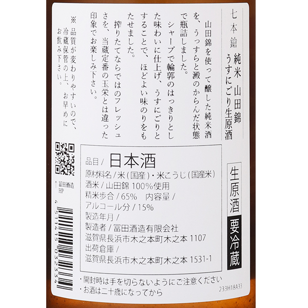 七本鎗 純米 山田錦 うすにごり生原酒