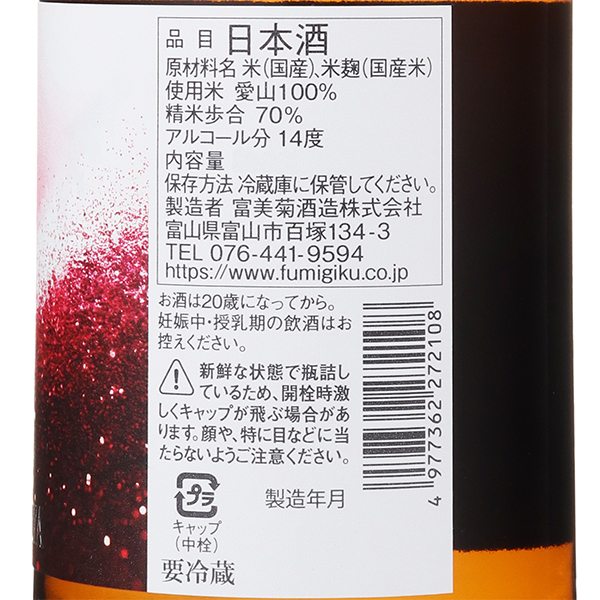 “酒米のダイヤモンド”とも称される「愛山」を敢えて70%に磨き、「愛山」らしい絢爛たる味わいを引き出しながらも、アルコール度数14度台に抑えることで、濃醇な旨味と軽快な飲み心地の両立を追求した一本です。もぎたての白葡萄を思わせるフレッシュでグラマラスな芳香が穏やかに鼻腔をくすぐり、エレガントで芳醇な「愛山」らしい豊かな旨味と甘味が、優しく滑らかに口中へと広がります。やがて雪解けのように柔らかな余韻が、そっと喉元に染み入る一本です。雑味の一切を削ぎ落としたかのような綺麗な味わいは、和食はもちろんのことフレンチやイタリアンなど幅広いお料理と調和し、シチュエーションを問わず食卓に花を添えます。