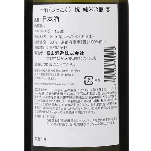 既存の十石の酵母を変え、京都市産業技術研究所がもつ5種の酵母のうち、酢酸イソアミル系を多くつくると言われている「京の華」を採用しています。穏やかな香りと柔らかい味わいで、春の食材と合わせたり、酵母違いとして通常品との飲み比べにもおすすめです。また、ラベルも実際の十石舟が走る川で見られる、桜が咲き誇る情景を閉じ込めています。上品に春めく松山酒造の自信作です!蔵紹介