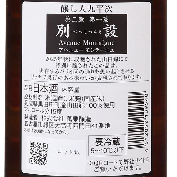 日本酒はもっともっと楽しくなれる!寛政元年、1789年創業。ひつまぶしや味噌かつなどのグルメや、名古屋城や徳川園など観光名所も多い愛知県名古屋市に蔵はあります。萬乗醸造は兵庫県黒田庄に田んぼを持ち、酒造りを原料である米からとらえ、代表銘柄である九平次を醸しています。さらに、フランスブルゴーニュに渡り、ワイン造りの観点から日本酒造りに生かす技術や知識を、現地で実際に醸すことで学んでいる蔵元です。人気銘柄となった今でも、味わいや日本酒というものを追及する思いは一層強くなっています。ほのかに感じるフレッシュさのあるガス感と、キレよく飲みやすさを演出する酸味。是非ワイングラスで楽しんで頂きたいです。