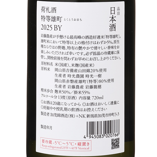 「荷札酒」シリーズは、時期やロットによって使用する酒米や製造方法などを変え、それを荷札に表記して販売される人気商品です。今回使用された雄町米は、岡山県赤磐市の岩藤農産・岩藤龍穂氏が手掛ける「特等」格付けの雄町です。雄町米において特等以上の格付けはわずか5%とされる稀少米です。最高峰の酒造好適米の素晴らしさを是非ご堪能ください。使用米:岡山県赤磐産 雄町(特等) 80%使用、岡山県吉備産 山田錦(一等)20%使用