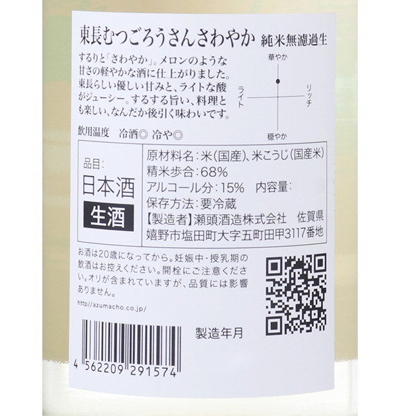 クラシックな東長らしさと、モダンの融合を表現するむつごろうさんシリーズ、「東長 純米 むつごろうさん さわやか 無濾過生原酒」が蔵出しとなります。春から初夏へと移り変わる季節に登場するむつごろうさんは、まさににするりと「さわやか」。無濾過生原酒ならではのぴちぴち感がフレッシュな純米酒です。まるで洋梨を思わせる甘くさわやかな香りがふわりと広がります。口に含むと軽やかな旨みと酸を感じ、純米らしさはきちんとありながらもさわやかな味わいです。まさにむつごろうシリーズらしい軽やかで可愛らしい味わいで、酒だけでもするすると美味しく、涼しげな冷菜や柑橘と合わせても楽しい初夏の「さわやか」な一本です。