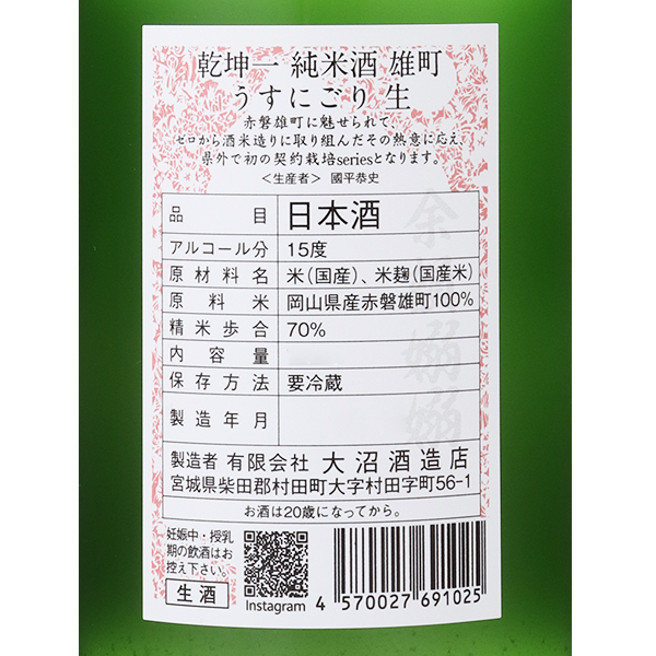 契約栽培シリーズ。乾坤一らしいドライなうすごりに仕上がっています。オリの滑らかさと雄町の味わいで、契約農家の想いを詰め込んで醸されています。蔵紹介