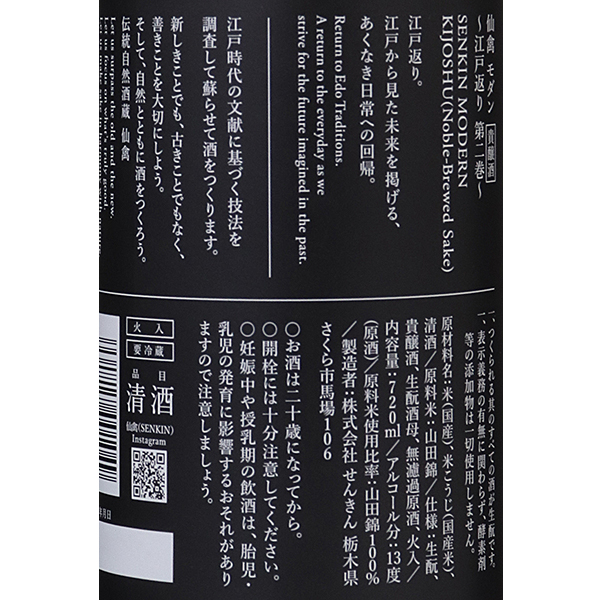 江戸返り。江戸から見た未来を掲げる、あくなき日常への回帰。後世に残すべき江戸時代の酒造法「生もと」を尊重し、守り、進化させながら仙禽流にモダナイズ。江戸返りをテーマに「農業」「技法」「思想」に焦点を合わせた新ブランドです。新生モダンは全量生もと造りとなり、全てのモダンを集結。肆式はトップグレードの「鶴鳴 醸(かもす)」同様、江戸古式の貴醸酒となります。