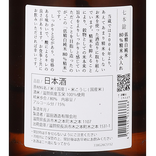 現蔵元、十五代冨田泰伸さんは酒造りの修行に入る前、アメリカ、ヨーロッパ各地のワイナリーや蒸留所を巡った際に、地酒であることの意味やその価値について深く考えるようになりました。その経験を活かし、地元篤農家との契約栽培をベースに、玉栄や吟吹雪そして渡船といった酒米を中心とした、地元の米と水による本当の意味での地酒造りに取り組んでいます。また、完全無農薬米による酒造りや熟成酒にも挑戦し愛飲家の注目を集めています。骨太な味わいの中に、豊かな自然の滋味や深味が溢れ、どこか懐かしさも感じさせる七本鎗をぜひ味わってみてください。