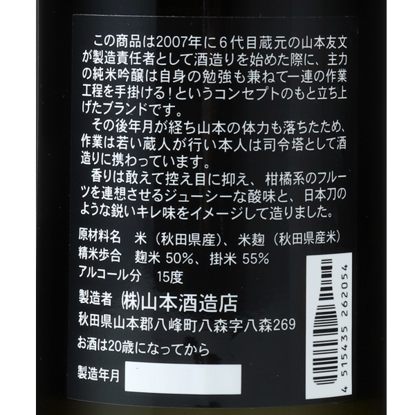 造りも遊びもどちらも真剣に明治34年、1901年創業。秋田県の北西部、秋田県山本郡八峰町に蔵はあります。蔵内にビートルズを流していることで有名な蔵元。さらに、平成20年に蔵で発見された蔵付き分離酵母に、「セクスィー山本酵母」と名付けるなど大変遊び心に溢れています。製造された商品もネーミングセンスに溢れ、非常にファンの多い蔵元です。麹室はルンバが掃除しており、製造にプラスになるのであればどんどん取り入れていく柔軟性もあります。遊び心のあるワクワクするお酒、是非試してください。