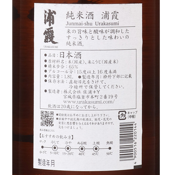 宮城を代表する銘醸蔵 塩釜の豊かな食文化に寄り添う酒享保9年(1724年)創業。美しい風情が多くの歌に詠まれ、歴史的にも食文化的にも恵まれた長い歴史の息づく港町塩竃に蔵はあります。全国新酒鑑評会では全国屈指の金賞受賞歴を誇ります。伝統を大切にし、上品な"品格のある酒"を目指しています。日本酒が持つほど良い米の旨み、味と香りの調和のとれた、まろやかで上品な飲み飽きのしない味わいが浦霞の特長です。食中で活きる味わいで、特に塩釜の特産であるマグロや牡蠣には好相性です。