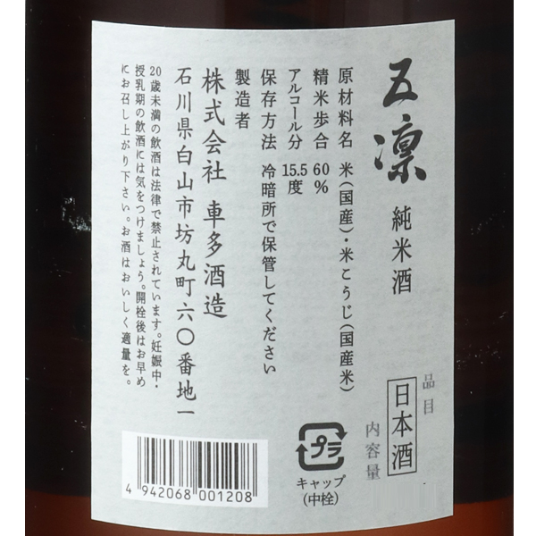 五凛は天狗舞を手がける車多酒造による、飲みやすい綺麗な味わいの別銘柄です。車多酒造は創業文政六年(1823年)、初代蔵元 車多太右衛門が諸国行脚の折に口にした各地の酒の旨さが忘れられず、自らの居する地に酒蔵を構え、旨い酒をとの一心で酒造りをはじめました。 かの時、蔵はうっそうたる森に囲まれており、木々の葉のすれあう音がまるで天狗の舞う音に聞こえたそうで、その謂れから、天狗舞の酒銘は生まれました。山田錦を60%まで磨き醸したこのお酒は、穏やかな米の香りに、柔らかい旨味とほどよい酸のキレがあります。山田錦らしい味わいを楽しめるバランスの良い純米酒です。蔵紹介