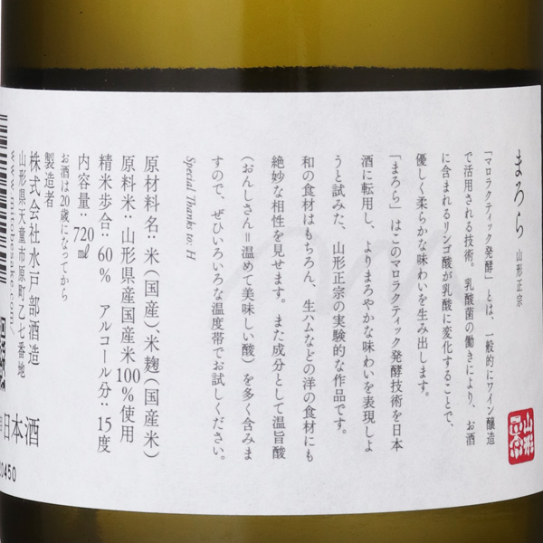 リンゴ酸(冷旨酸)を乳酸(温旨酸)に変えるマロラクティック発酵(Malo-Lactic Fermentation)によって醸された山形正宗 まろら。冷酒から熱燗まで幅広い温度帯で楽しめ、また生ハムとの相性が素晴らしい。蔵紹介