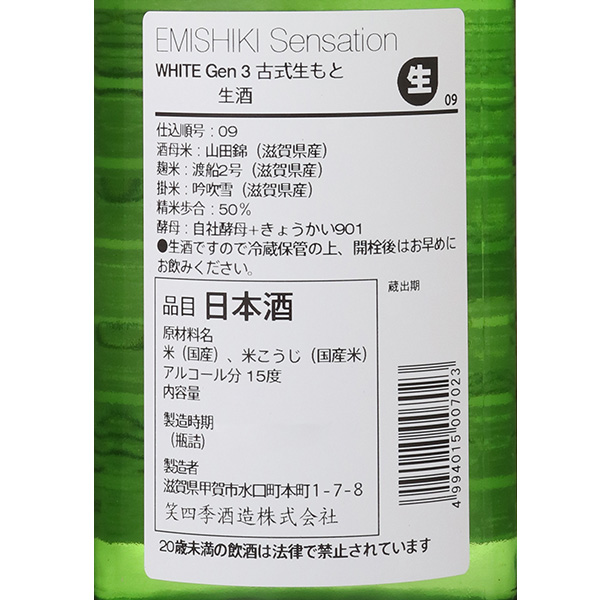 独創的にして美味なる酒と感動を、より多くの人に伝えたい明治25年創業。巡る季節…花が咲き誇り笑う山、太陽の日差し、照紅葉、冷たい風。酒銘にある「四季」の移ろいの儚さ、自然の美しさと醸造責任者 竹島充修がそこから感じる思い出、憧れ、様々なインスピレーションに基いて笑四季の酒質とコンセプトは設計されています。 笑四季の哲学である「天地自然の理に従う」のもとに、滋賀県内の目の届く範囲だけの優良な原料米を選びぬき、手作業と最新技術の融合により、五感を研ぎ澄ませながら寒造りを行なっています。