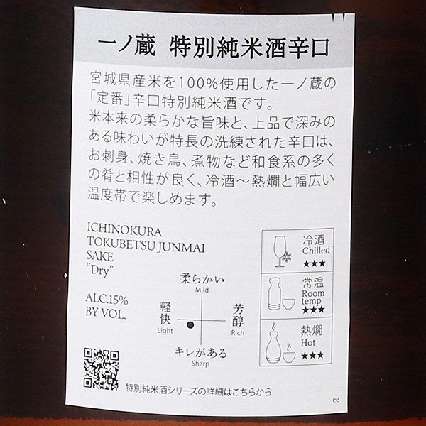 原料米には宮城県産米を100%使用し、丁寧に仕込んだ特別純米酒です。米本来の柔らかな旨味がバランスよく溶け、上品で深みのある味わいを醸し出しています。一ノ蔵の定番酒、洗練された辛口の味をお楽しみください。蔵紹介
