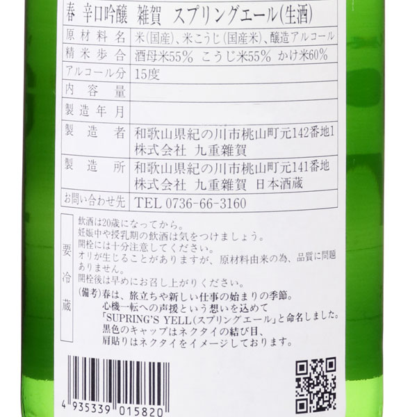 春は旅立ちや新たなスタートを切る季節。心機一転へ新たに挑戦を始める皆様へ声援を送りたいとの気持ちを込めSpring’s Yellと名付けました。雑賀らしい爽快なキレと、フレッシュな酸味は少しずつ暖かくなるこの季節にピッタリな味わいとなっています。蔵紹介